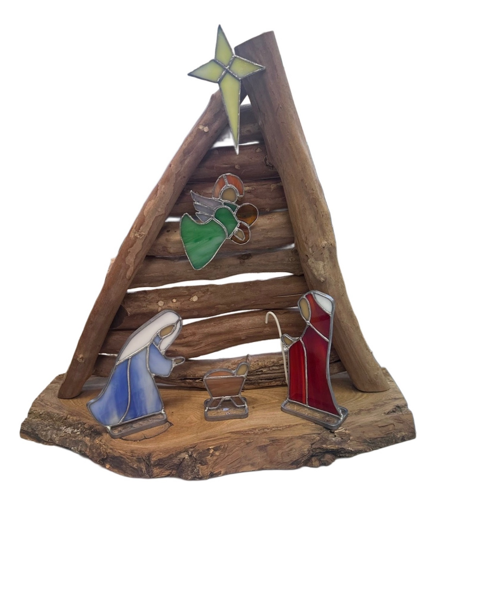 A one of a kind stunning nativity made from oak, crepe myrtle and stained glass.