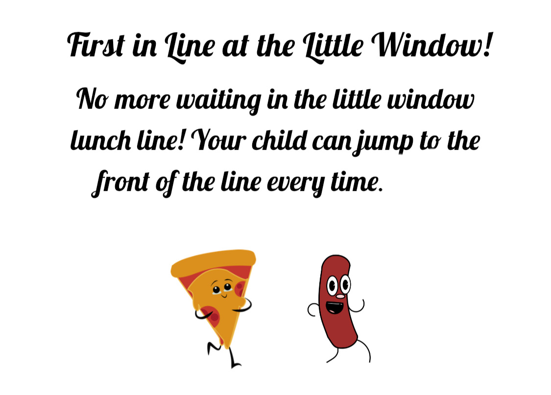 No more waiting in line at the little window at lunchtime! Jump to the front of the line every time for the 2026-2027 school year.