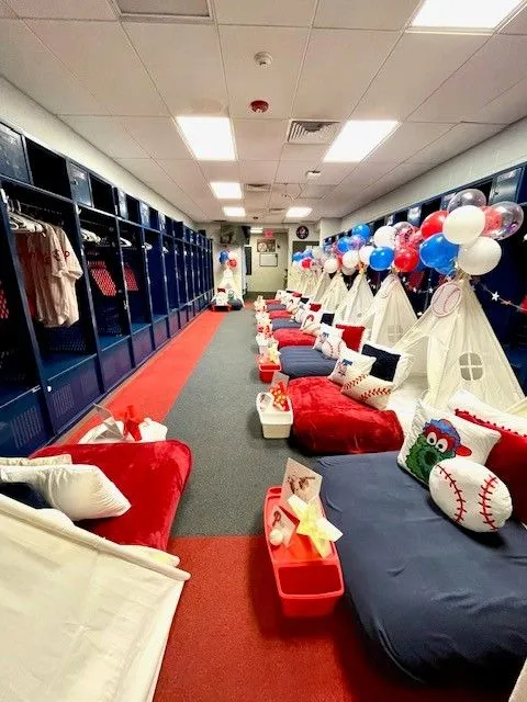 Party for 8 with Balloons. Celebrate in style with a themed glamping party! Includes tents, air mattresses, bedding, light blanket, applicable decor, bed tray, and theme name frame.