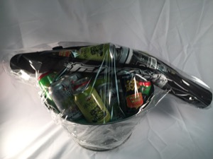 Neoprene beer cooler with carrying strap (holds 6, 12-oz cans), six-pack of Bells Hopslammer IPA, six-pack of Victory Vital IPA, six-pack of Sly Fox Route 113 IPA, 6 pack of miscellaneous IPAs in a galvanized bucket.