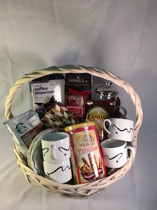 Delight in your Saturday mornings with this French Press and all the fixings for great coffee, including cool black and white coffee cups and saucers, inlaid wood coasters, 2 bags of ground coffee, coffee storage bin, peppermint spoons, biscotti and piroulines.