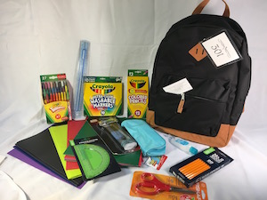 Blue backpack including scissors, box of pencils, colored pencils, Twistable crayons, star wars pencil set, buzz light year pencil pouch ruler, protractor, washable markers, travel-size hand sanitizer and 9 folders and a St. Ignatius lunch ticket good for 10 school lunches.
